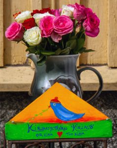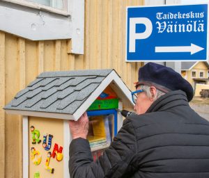 – Tämä pieni kirjasto sai alkunsa kaukaa, Seattlesta, jossa olimme käymässä vanhimman poikamme perheen luona. Siellä kävelyreittien varrella pienet kirjakodit pysäyttivät. Niissä oli jotakin hyvin yksinkertaista – ja samalla hyvin suurta. Tutustuimme ideaan tarkemmin ja siitä matkamuistona ideoimme tänne ”Kirjanystävän pienen kirjaston”.